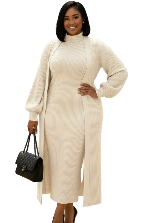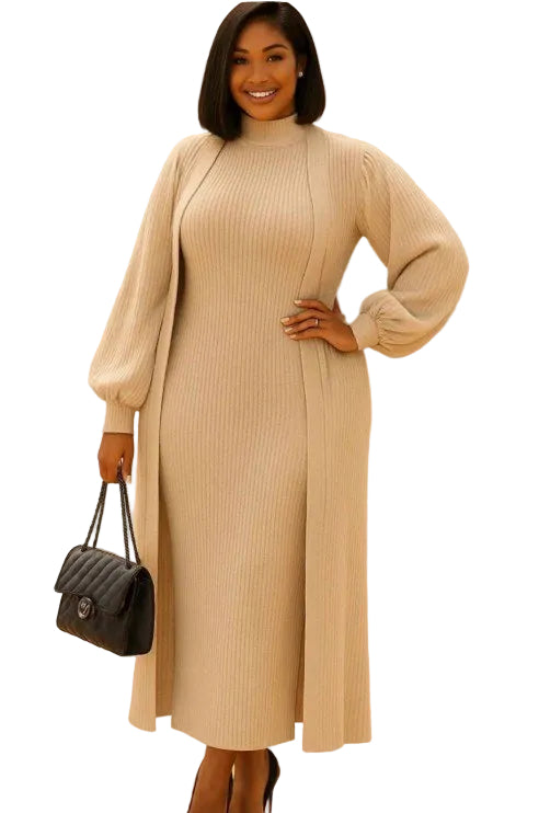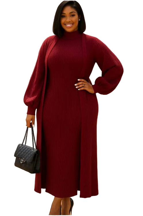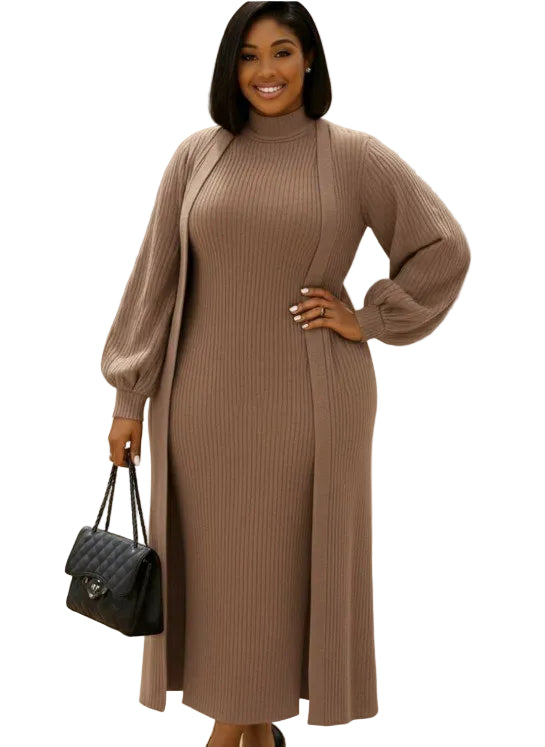 COZY RIBBED KNIT MAXI DRESS AND LONG CARDIGAN SET