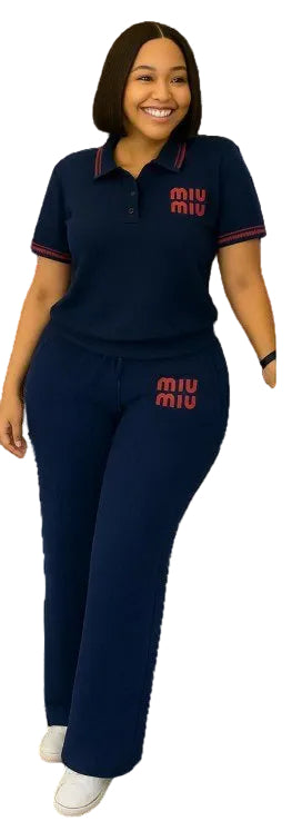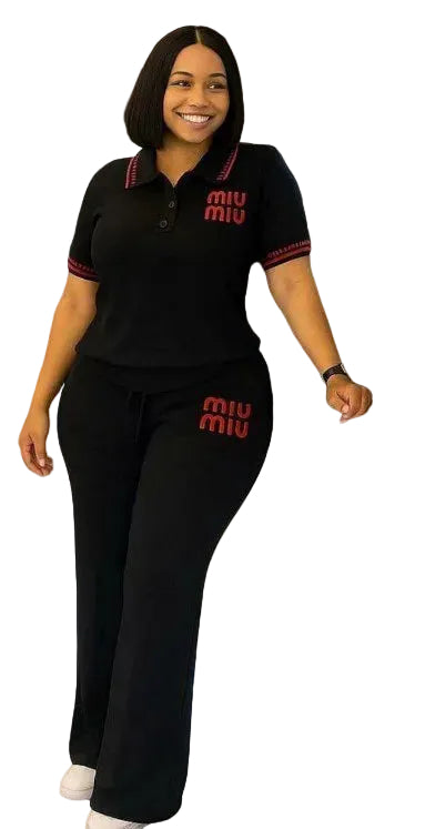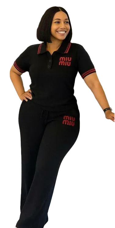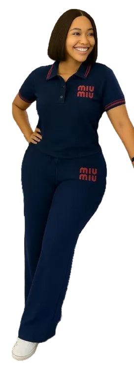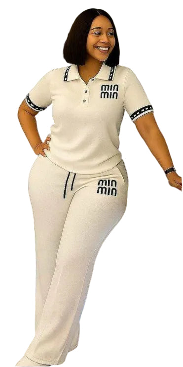 • Style: Preppy two-piece set featuring a short-sleeve collared polo top with embroidered lettering and contrasting trim, paired with comfortable wide-leg pants,