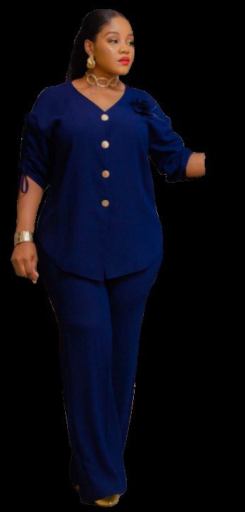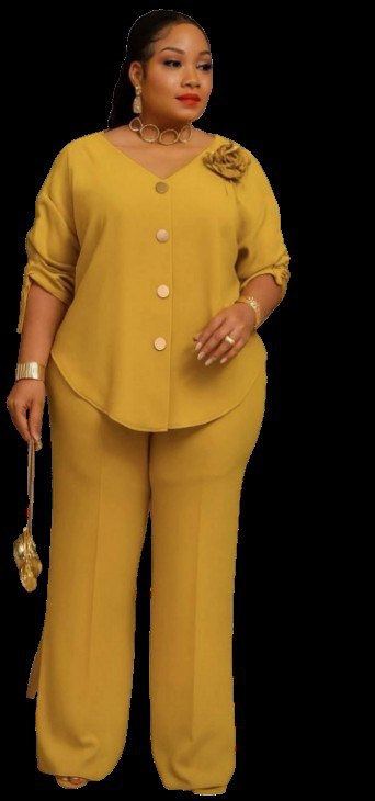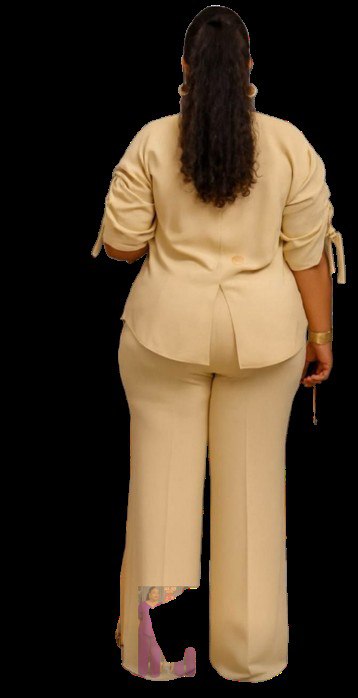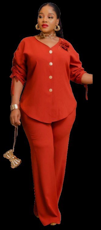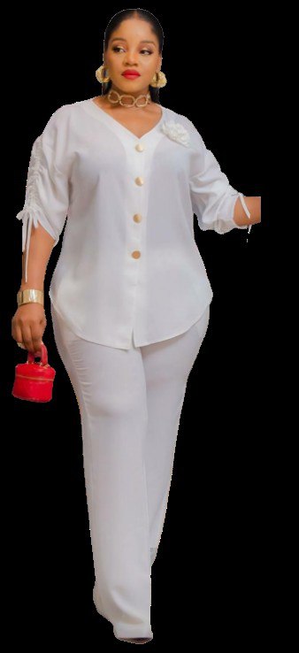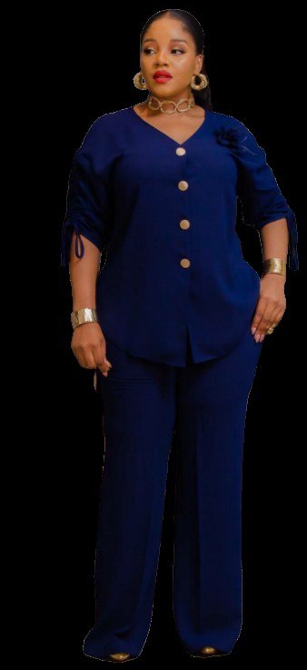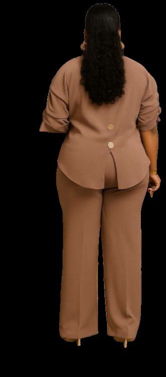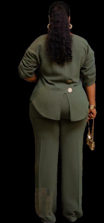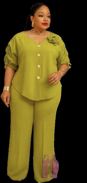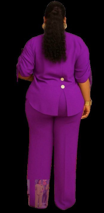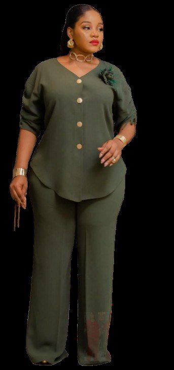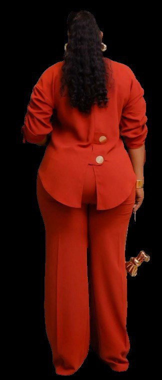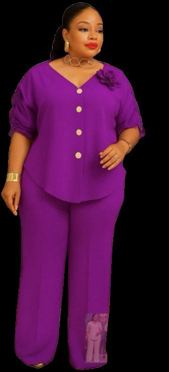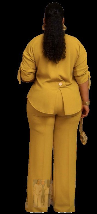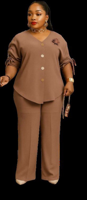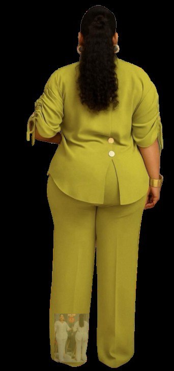 • Style: Modern two-piece set featuring a button-down tunic with ruching on the sleeves and a high-low hem, paired with tailored trousers,
