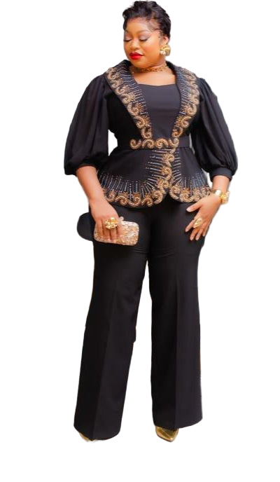Style: Ladies two-piece outfit featuring an embellished design print blouse with flared sleeves and matching long open wide-leg trousers,