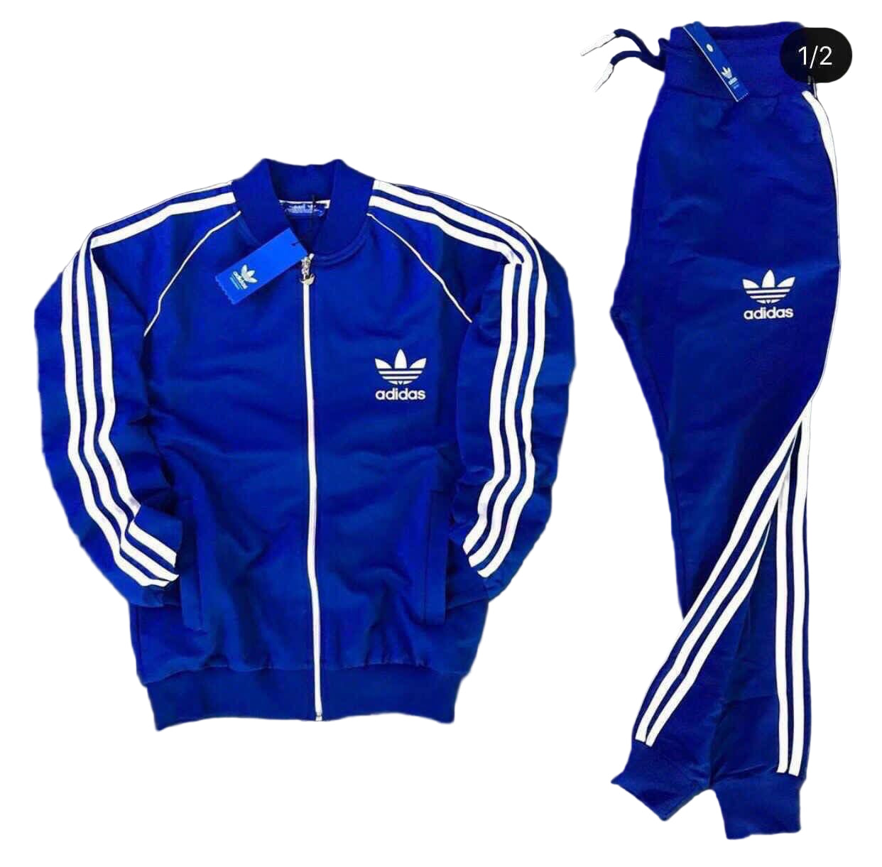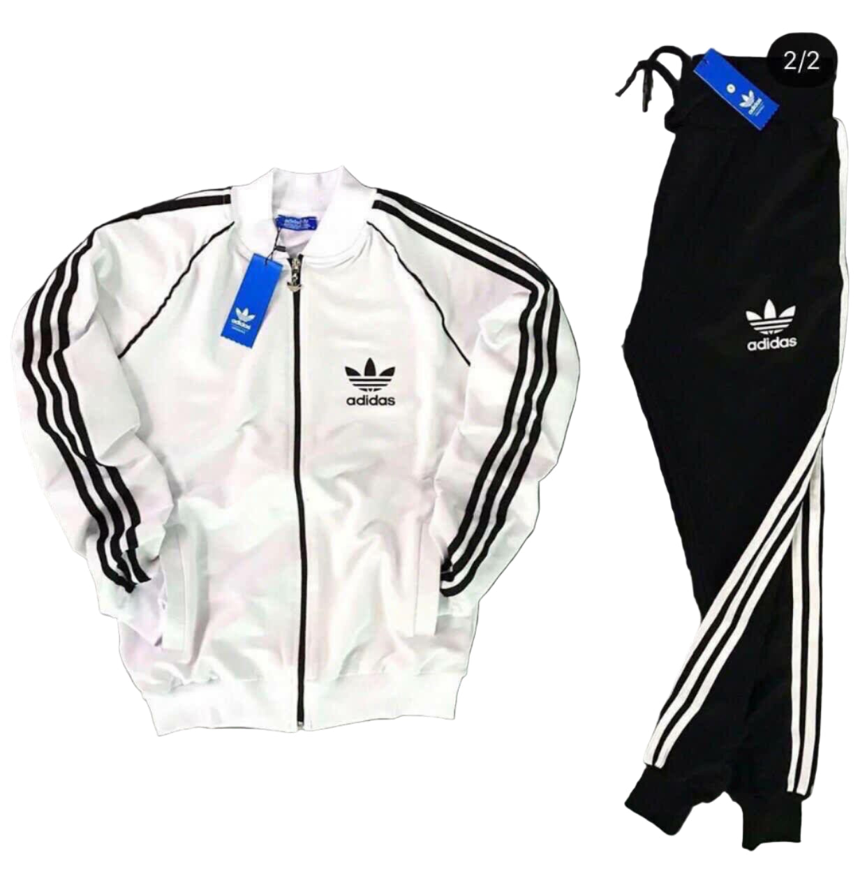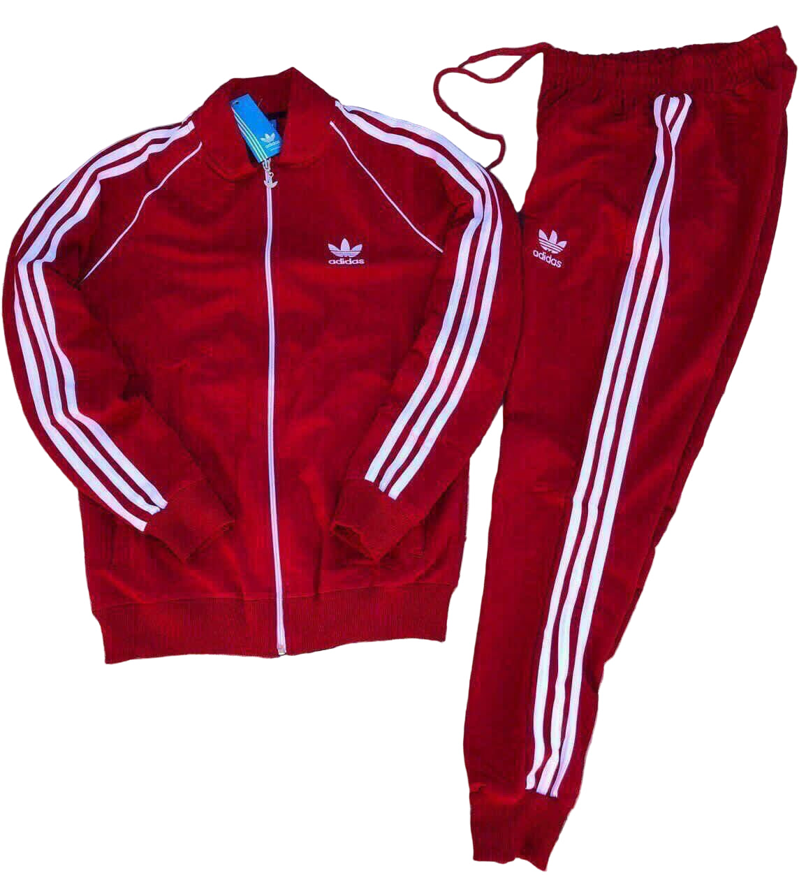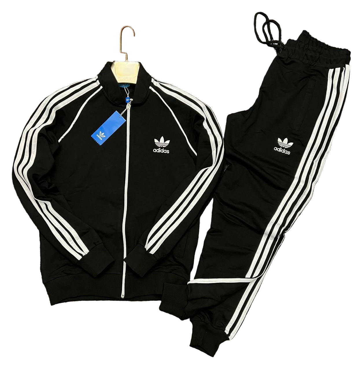 Style: The timeless men's tracksuit, featuring a zip-up track jacket and matching jogger pants with the iconic 3-stripe design on the sleeves and legs.