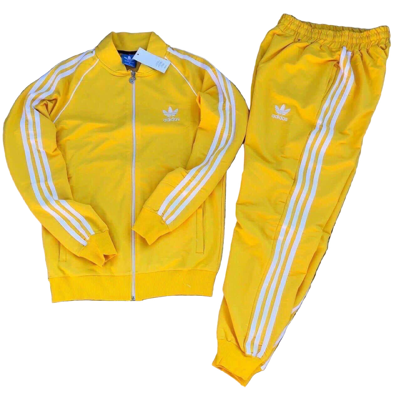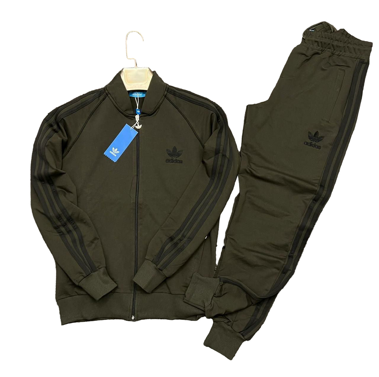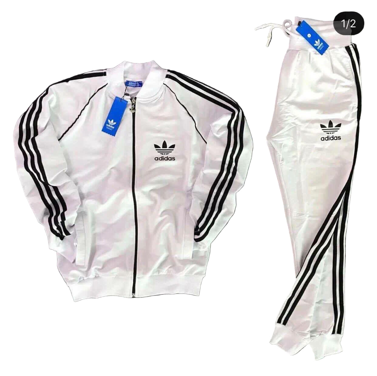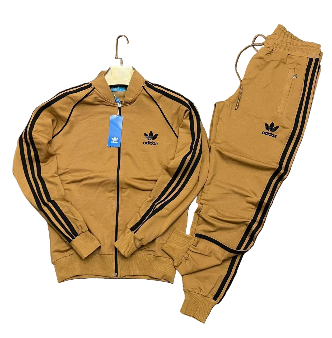 Style: The timeless men's tracksuit, featuring a zip-up track jacket and matching jogger pants with the iconic 3-stripe design on the sleeves and legs.