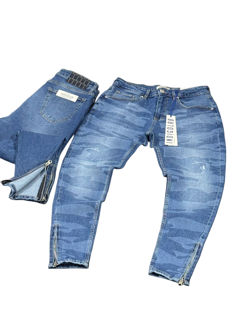Style: A bold men's jean featuring a unique blue camouflage pattern, a slim, tapered fit, and functional zippers at the inner ankles for a definitive streetwear look.
