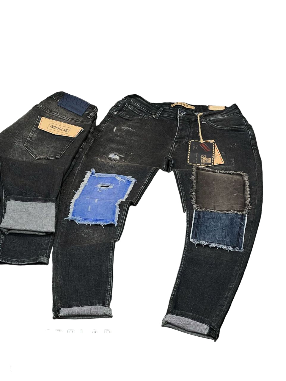 Style: A rugged men's jean in a slightly faded black wash, combining ribbed moto panels with distressed details for a textured, biker-inspired aesthetic.