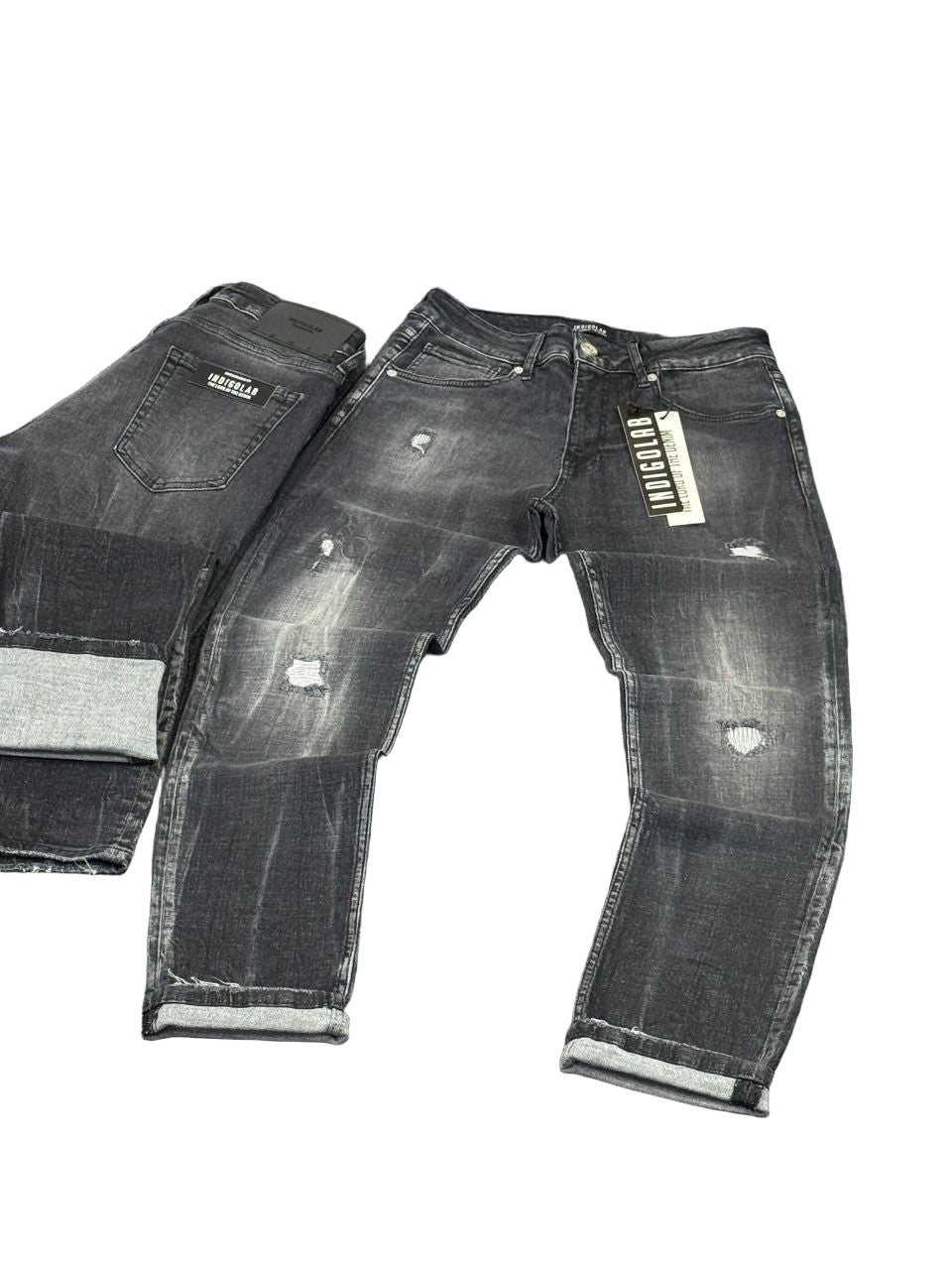 Style: A unique men's jean in a dark black wash, featuring distinctive faded panels and ripped details for a visually textured and dimensional look.