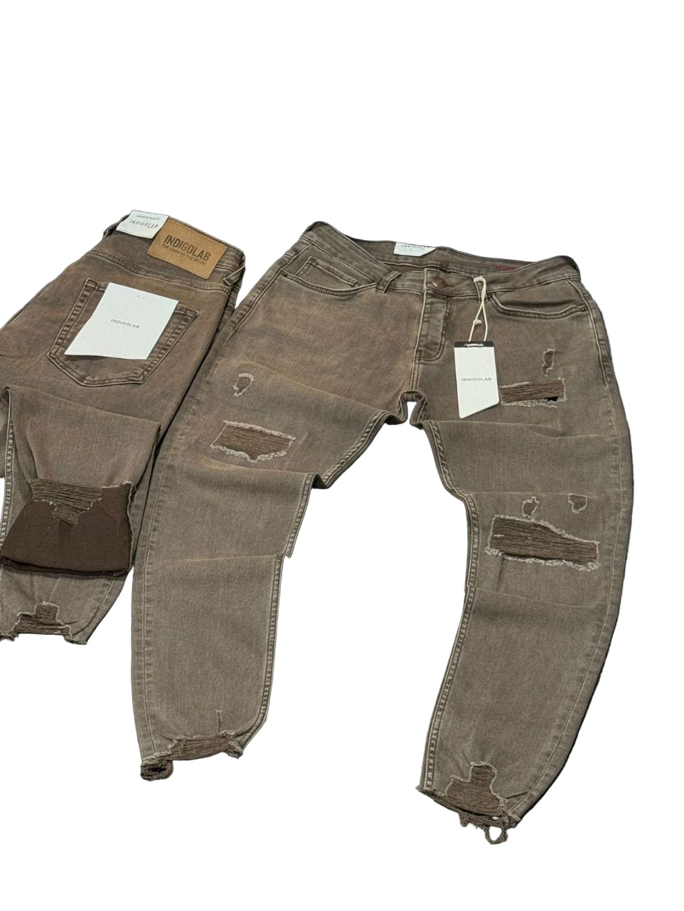 Material: Denim,Style: A rugged and unique men's jean in a washed brown, featuring heavy distressing, frayed hems, and ripped details... Read more