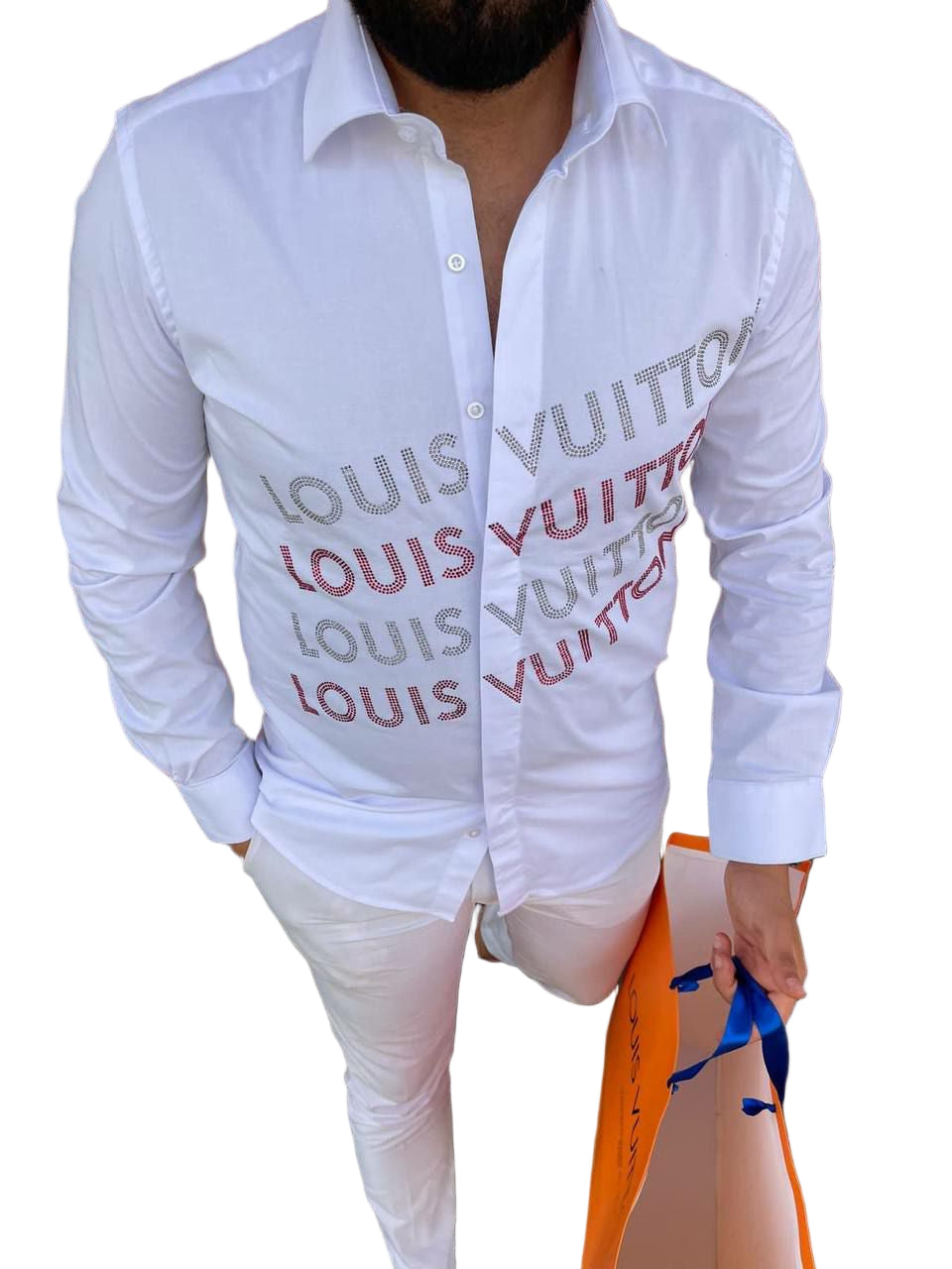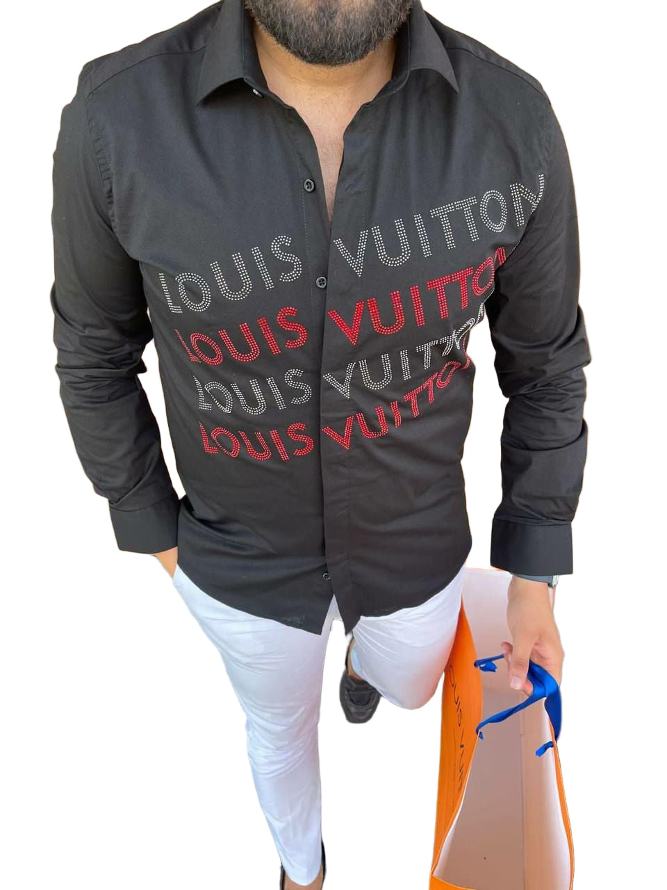 Style: Modern men's casual shirt featuring a distinctive repeating text stud design, perfect for smart-casual occasions.