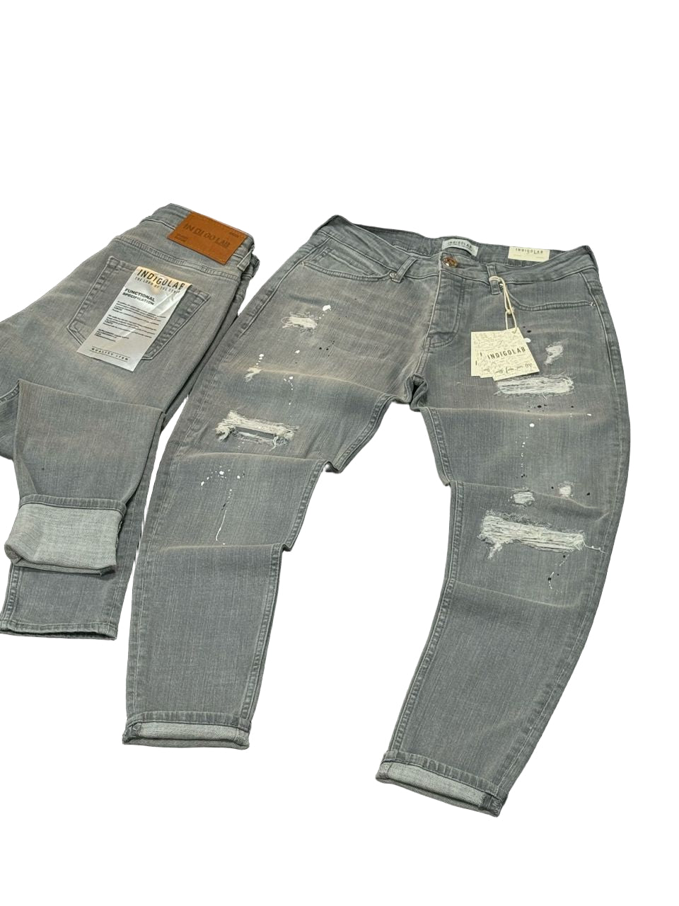Material: Denim,Style: An artistic men's jean in a washed grey, featuring ripped details on the thighs and subtle white paint... Read more