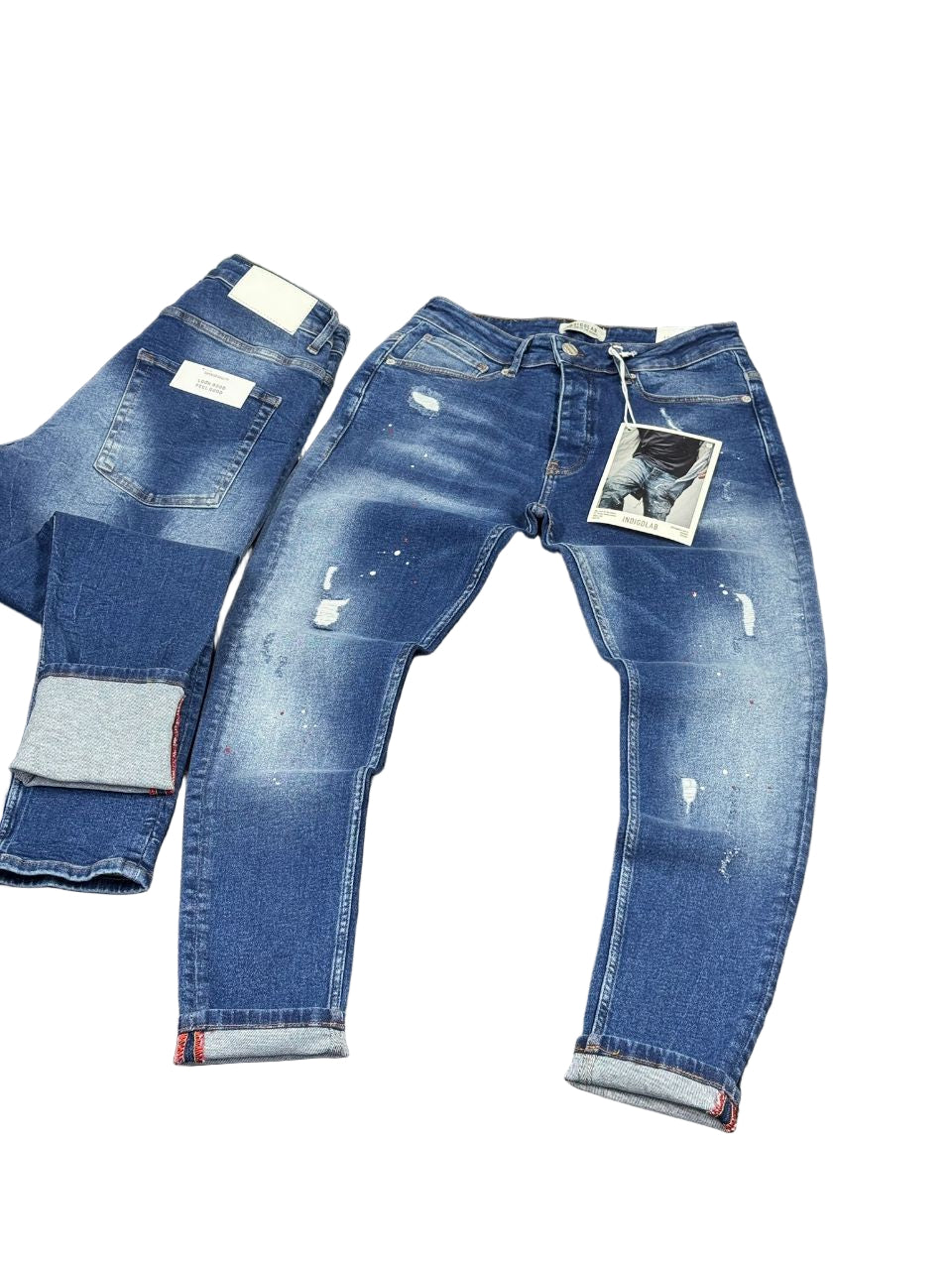 Style: A modern men's slim-fit jean in a deep blue wash, enhanced with subtle fading, ripped details, and artistic paint splatters for a creative touch.