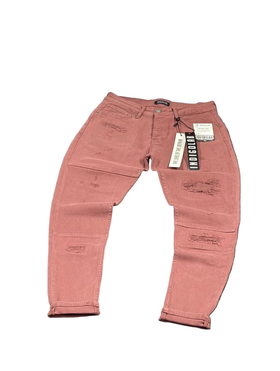 Style: A unique, fashion-forward men's jean in a washed pink, featuring paneled construction and ripped details for a textured, modern look.