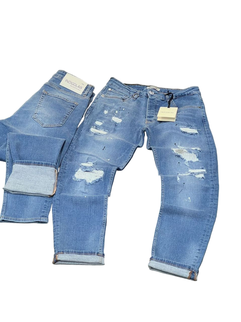Style: A creative men's jean in a classic light blue wash, featuring ripped knees, heavy distressing, and black and white paint splatter for an artistic, lived-in feel.