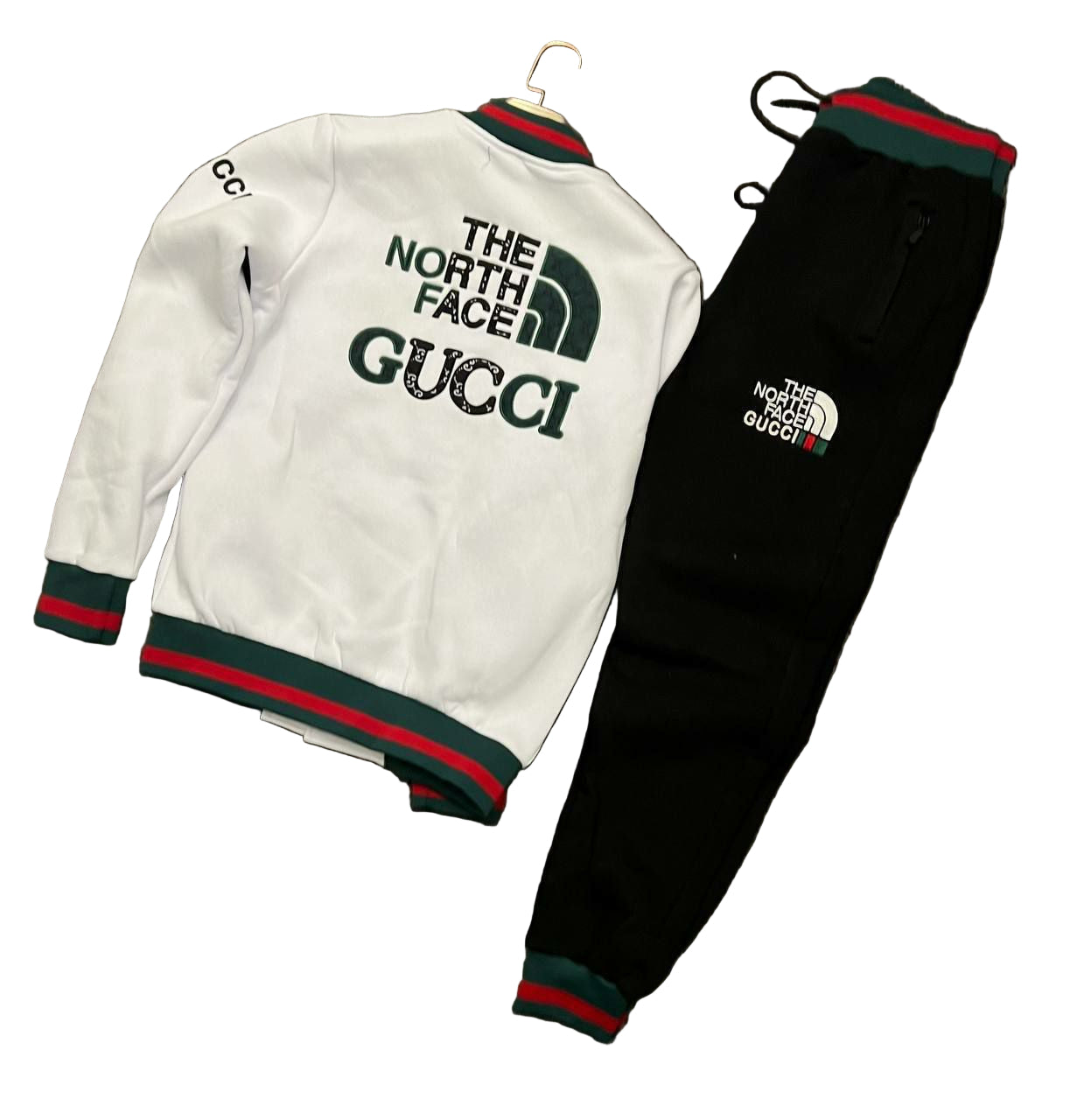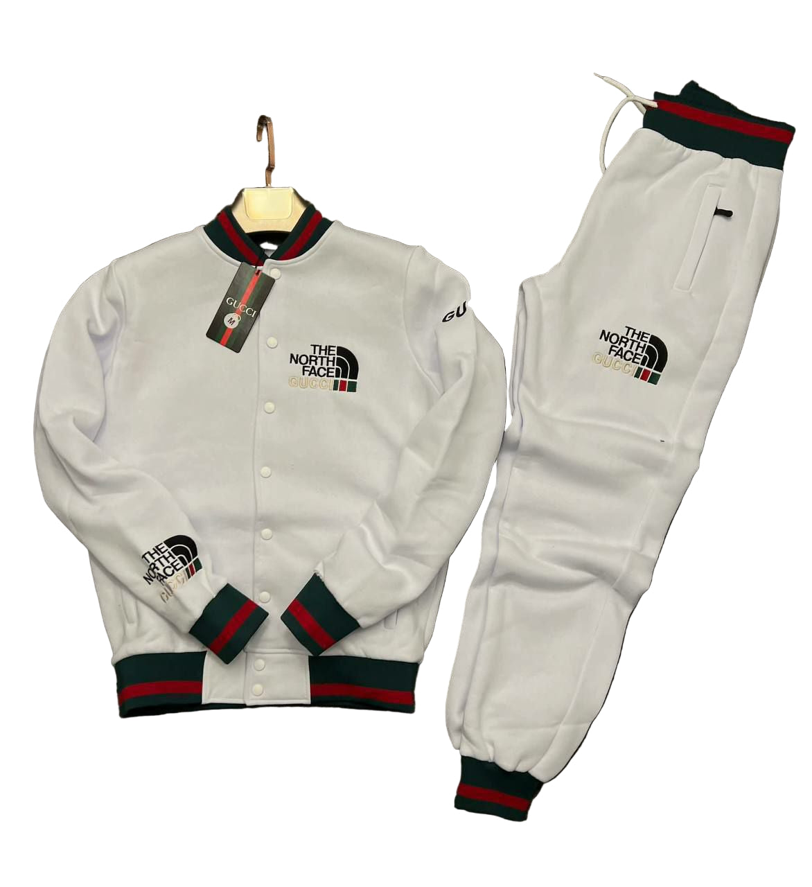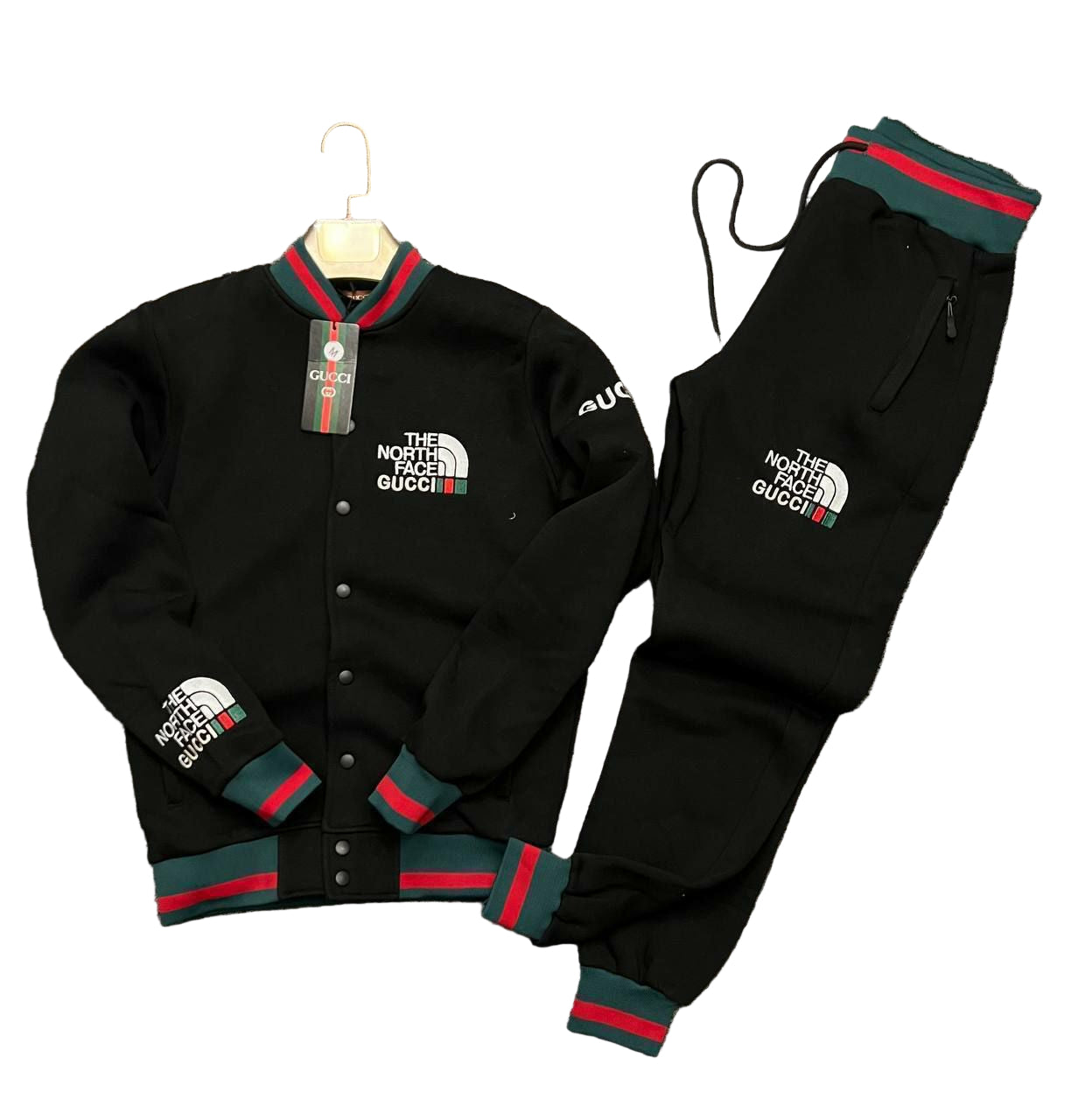 Style: A high-fashion collaboration men's two-piece tracksuit, featuring a varsity-style bomber jacket and matching jogger pants with branding.