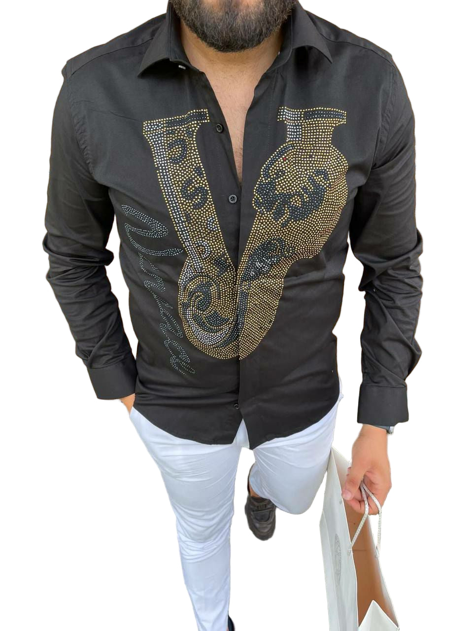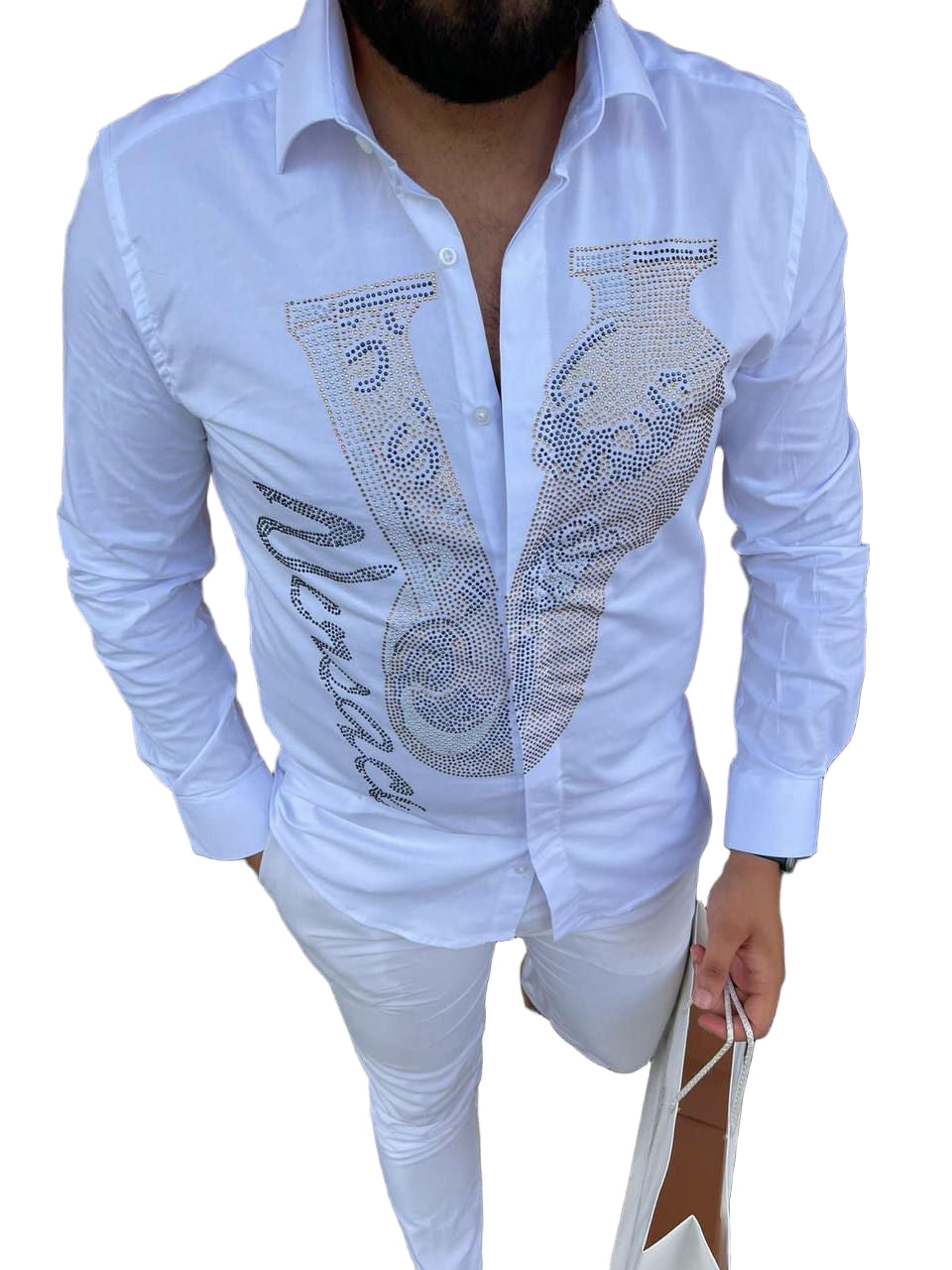 Material: Cotton Blend,Style: Modern men's casual shirt featuring a distinctive V-Barocco stud design, perfect for smart-casual occasions.Applicable Season: All Seasons,Pattern... Read more
